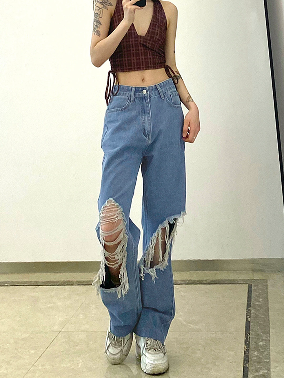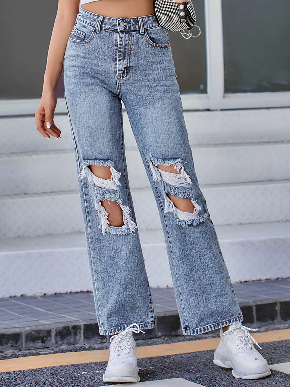 Blue Wide Leg Highly Distressed Cotton Light Fade Jeans