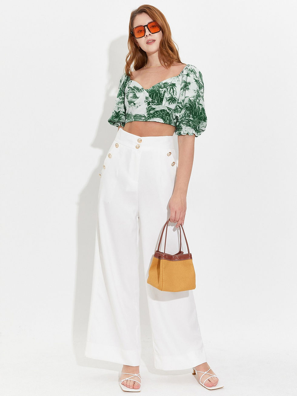 Beige & Green Floral Print Sweetheart Neck Crop Top